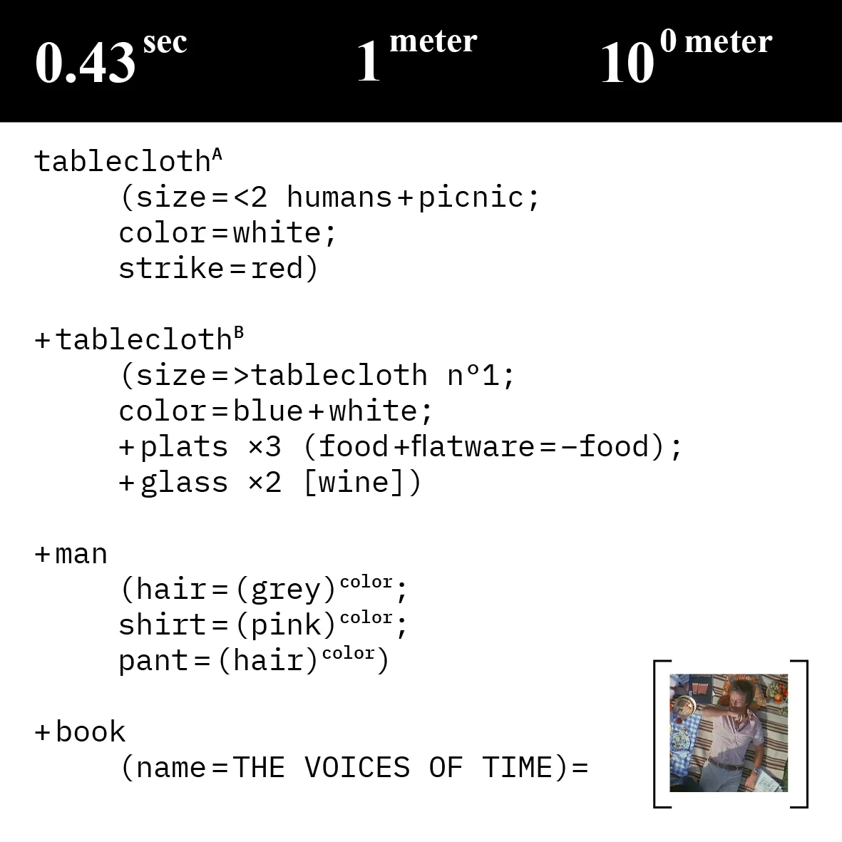 Le visuel regroupe tous les éléments filmiques, de la voix off aux images accompagnées de formules descriptives.