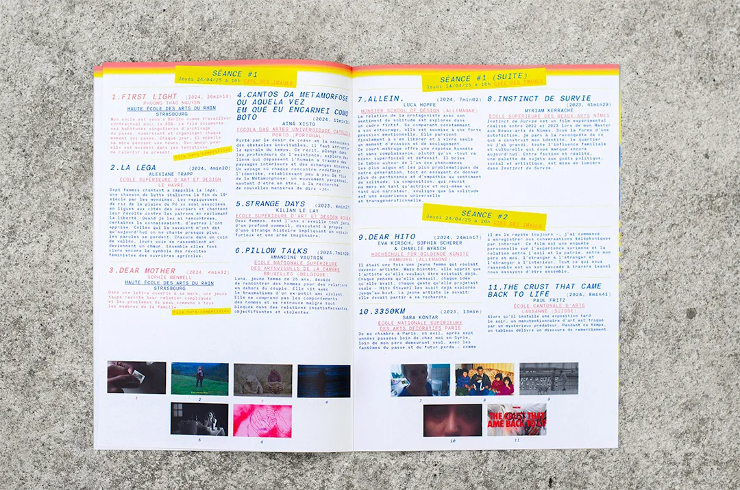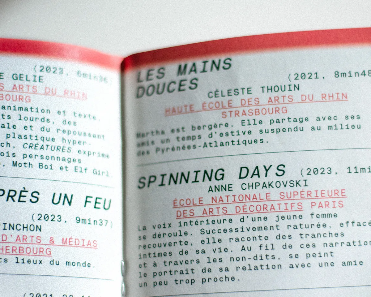 La bichromie rose/vert, principe central de l'identité, harmonise les 2 images issues des films lauréats de l'édition 2023. Le texte en blanc aère l'ensemble.