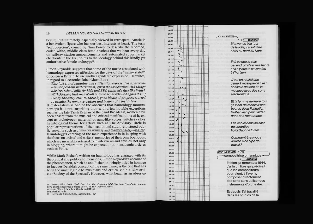 Le livre retranscrit tous les sons du films, des voix off à la musique inspiré par l'Oramics. Cette partition montre à la fois le timecode du film, et les Hertzs des sons dessinés.